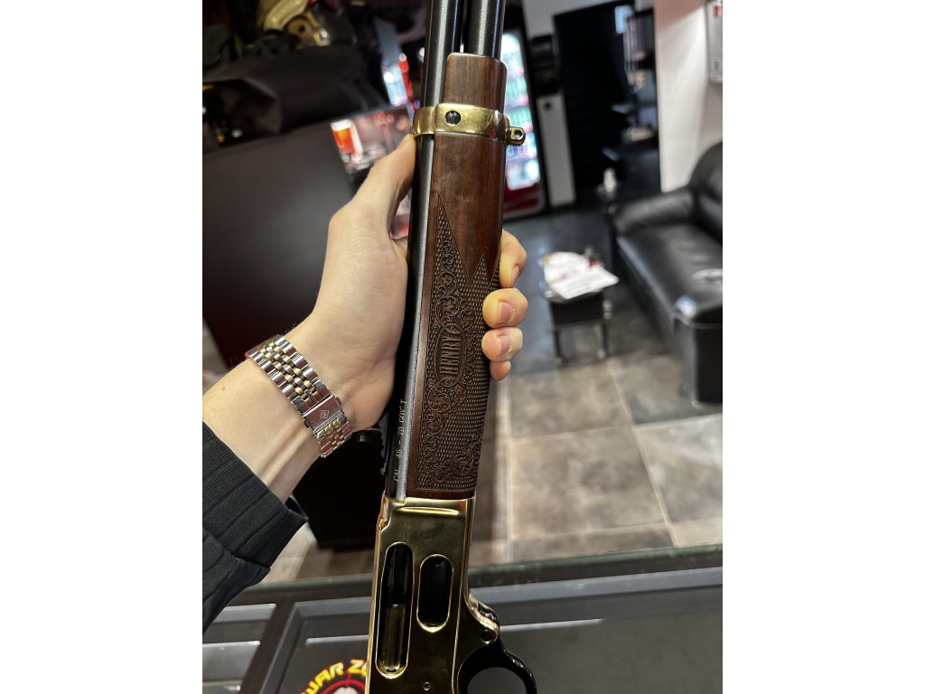 Další vlastnosti pušky Henry Side Gate Lever Action zahrnují tvrzený mosazný přijímač, který má stejnou výtěžnost a pevnost v tahu jako ocelový přijímač. Hlavňový pás a pažba jsou také vyrobeny z mosazi a zbraň je dokončena krásným americkým ořechovým dřevem s hlubokým rytím. Puška má 20-palcovou modrou hlaveň, která je zakončena rear sight s buckhorn a předním hledím s slonovinovým korálkem.
